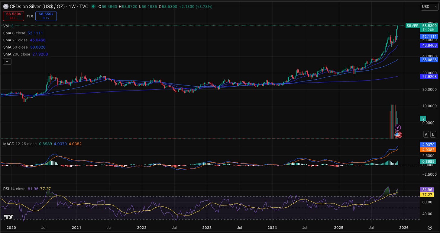 I’m sure that some of you have been paying attention to what has been going on with silver lately, and I don’t think the recent move in silver is done. There are other people that are far more qualified to comment on the plumbing of gold and silver markets, but it is interesting to see some of the recent news. You have Black Friday COMEX shutdowns, Shanghai silver trading above 60, and rumors that Paul Tudor Jones buying $1.9B of silver futures. With all of that, it’s easy to look at silver as being overcooked short term, but if we do start to issues with physical delivery and paper markets, silver’s run is far from over. Even if we do take a pause here, I think the setup is very attractive looking ahead to 2026.