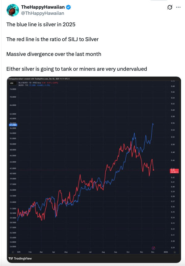 I could pontificate about the gold to silver ratio, or why I think it’s probably going lower in 2026, but I think gold and silver are both in durable bull markets. I think we could see gold to silver ratio hit 60 (not tomorrow, but at some point in the next couple years), and I don’t think that will happen with gold sitting in the low-4,000 range. I will try to avoid the hyperbolic price targets (silver to $100 an ounce by the end of Q1 2026, etc.), but I wouldn’t be surprised at all if silver grinds higher between now and the end of 2026. I have read and listened to a couple pieces in the last week, but a couple stood out. This recent piece on the gold to silver ratio will be an interesting read for anyone that wants some historical context on where we are today, and Vince Lanci’s video on the recent price action in silver is also worth a listen.