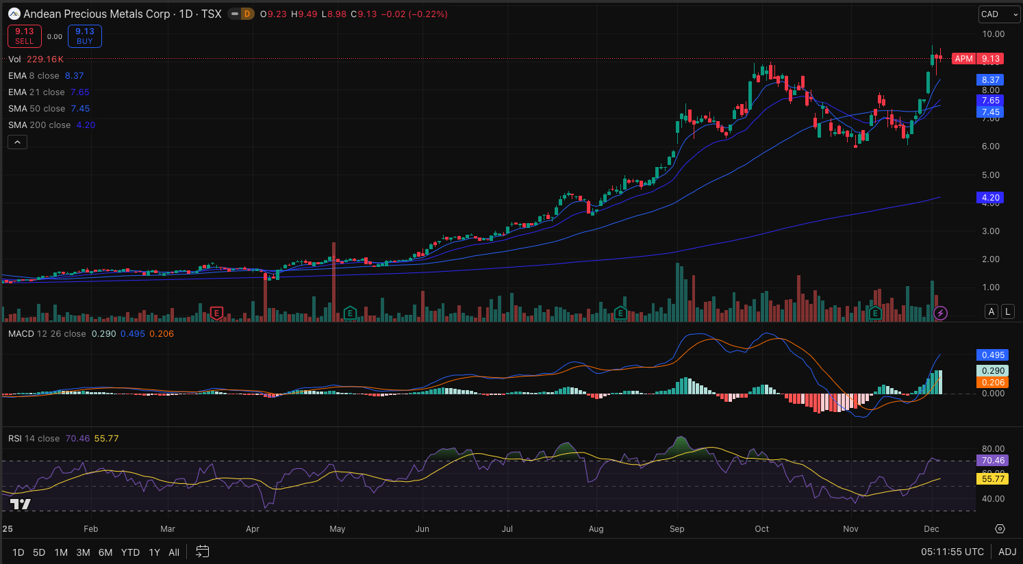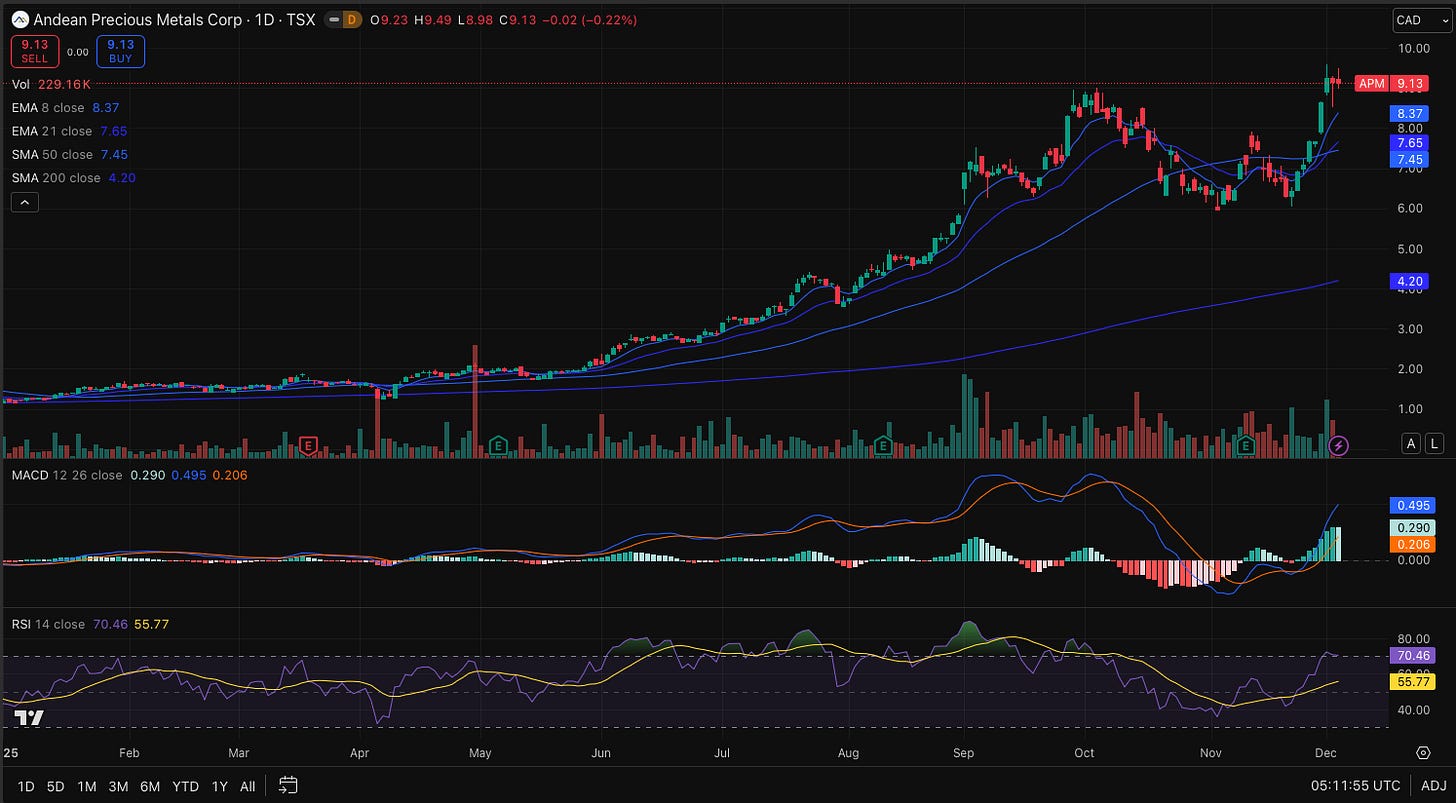 Their Bolivia operations remind me a little bit of Amerigo Resources, which processes the copper tailings from the Codelco mine in Chile. The difference is that they aren’t reliant on one mine, and instead take their silver oxide feedstock from multiple nearby silver mines. I think it makes sense to take a basket approach when it comes to the silver miners, and Andean is the lowest risk piece of my basket. Unless you think gold is going back to $3,000 and silver is going back to $30 or $40 an ounce and staying there, I think Andean Precious Metals has plenty of upside from here, even after the run it has had.