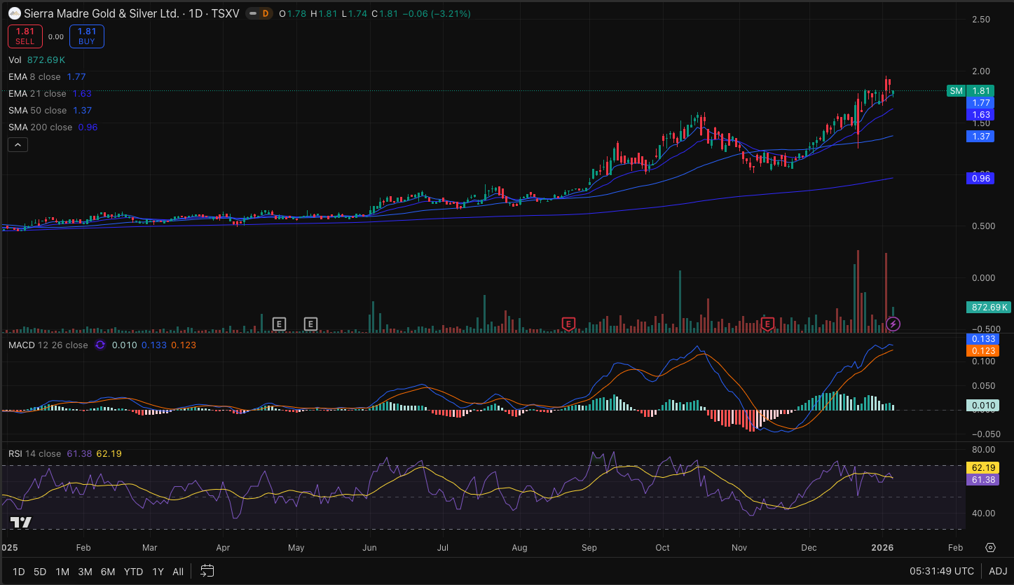 Over the last month, I have been going down silver miner rabbit hole (“pueblos”, as one of my friends likes to call them), because many of the miners haven’t kept up with the silver price. Most of the big miners aren’t even pricing in $50 or $60 an ounce for 2026, and some of the juniors, even after a very good performance in 2025, are still extremely cheap relative to silver. If you want to hear me ranting more on precious metals, that valuation gap on some of the miners, and current events in Venezuela and where we might be headed on that front, I recorded this pod on Tuesday. In short, I thought I was going to be done buying silver stocks a couple weeks ago, but I kept turning over rocks and deciding that it would be worth owning a little bit of this and a little bit of that. One of those more recent purchases is Sierra Madre Gold & Silver (SM.V on the TSX-V).