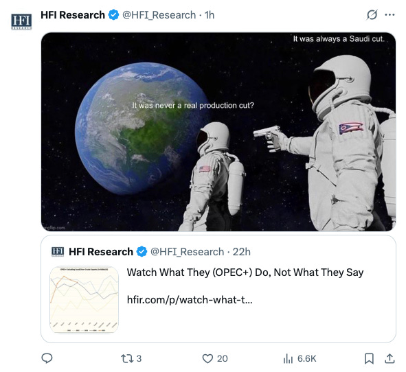I hope everyone is enjoying their long weekend, and I have a couple videos and some weekend reading for anyone that wants to get a headstart on this week. Before I get into that, I wanted to share a couple things that caught my eye on oil. I have the bones of a longer post on oil sitting in my drafts folder, but I think we are laying the foundation for the next leg higher in oil right now. It might take six months or a year, but I’m pretty confident that we are closer to a trough than we are to a peak. You see it in sentiment, you see it in positioning, and you have Capex cuts across the Permian that are probably going to show up in US production numbers over the next three to six months.
